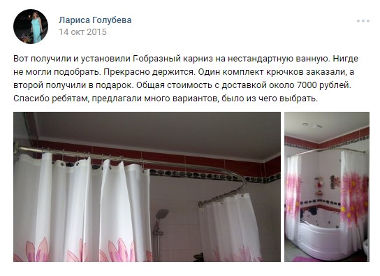 Добрый вечер ,заказывал карниз в ванну г - образный , остался очень доволен, большое вам спасибо